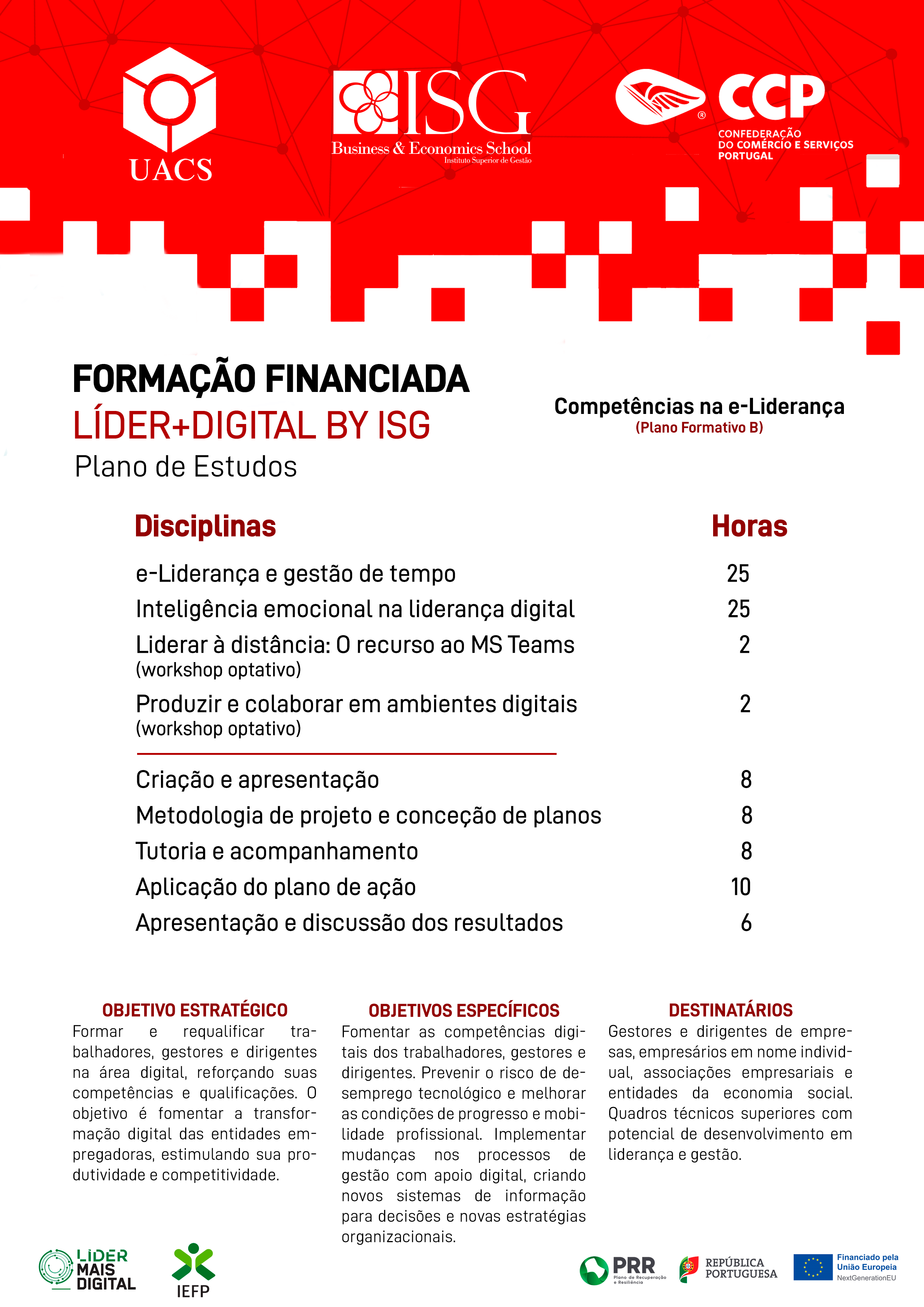 O ISG | Instituto Superior de Gestão, em consórcio com a CCP e a UACS, apresentam para Lisboa e Vale do Tejo do Plano Formativo totalmente gratuito focado nas Competências de e-Liderança, que visam capacitar os formandos de competências de gestão de liderança à distância, tendo em conta as novas competências que são exigidas num mundo cada vez mais competitivo onde o domínios das Novas Tecnologias e liderar à distância são requisitos obrigatórios para o respetivo sucesso no mercado de trabalho! Em caso de dúvida de como se candidatar, contate-nos através do número 961 376 505.